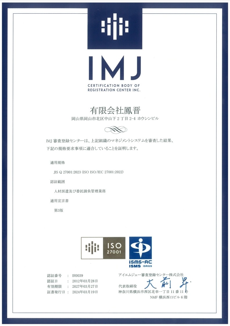 総合人材派遣のホウシンはISMS(情報セキュリティーマネージメント)を取得しています。弊社が管理する個人情報保護はご安心下さい。